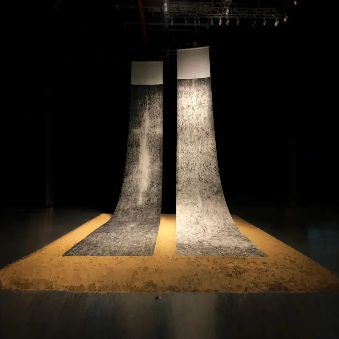 ▲ 邢罡《宇宙剧场·天机乍泄:黃河之水天上來》,蚕丝绢本特制水墨&黄沙,2013年