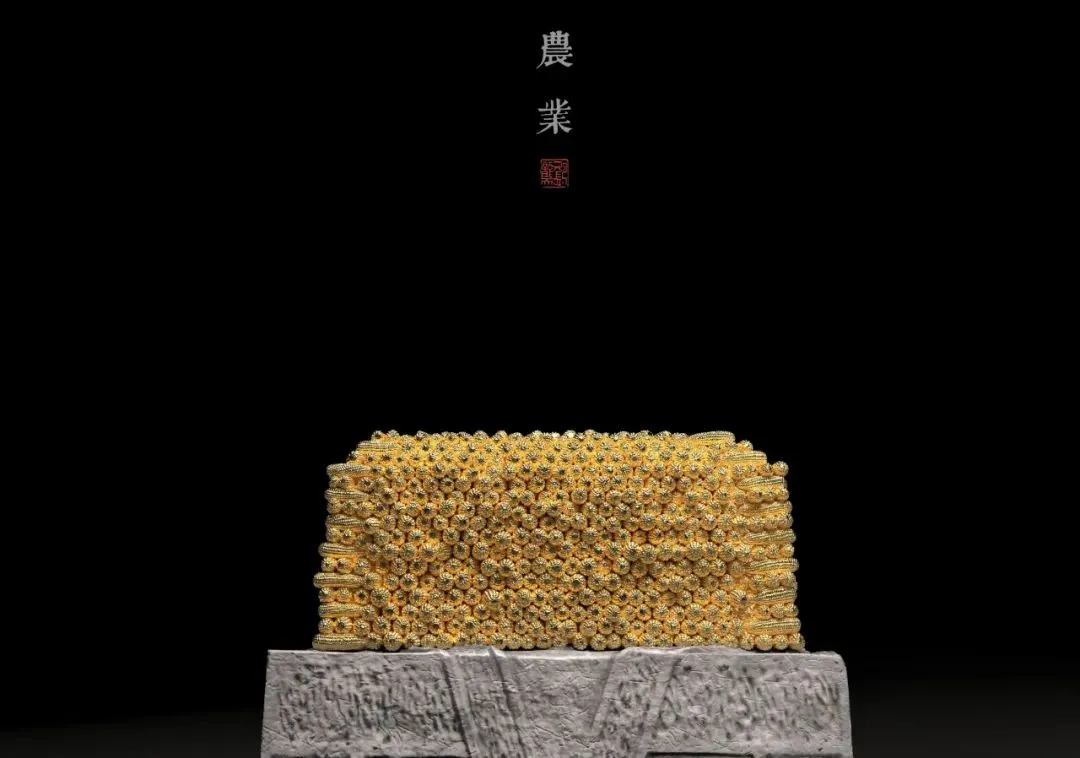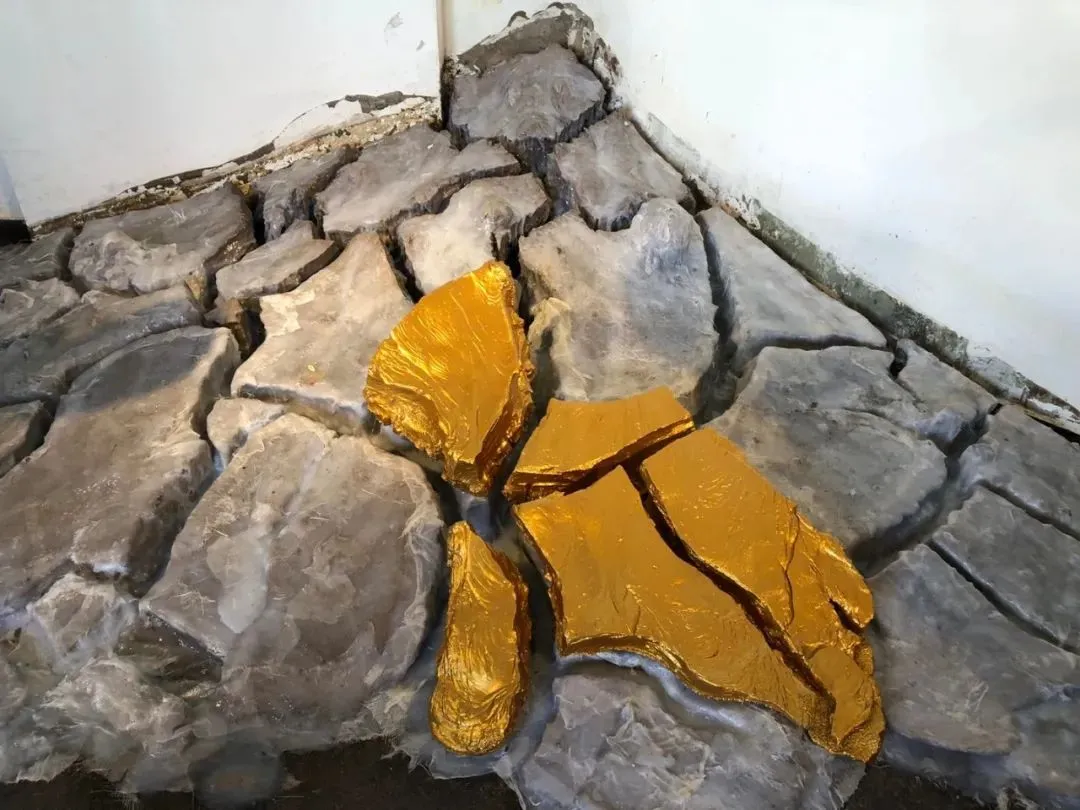 ▲ 刘䶮《第一产业》(部分) ,矿物颜料、金箔、银箔、铜箔、丙烯漆、大漆、树脂, 2000年